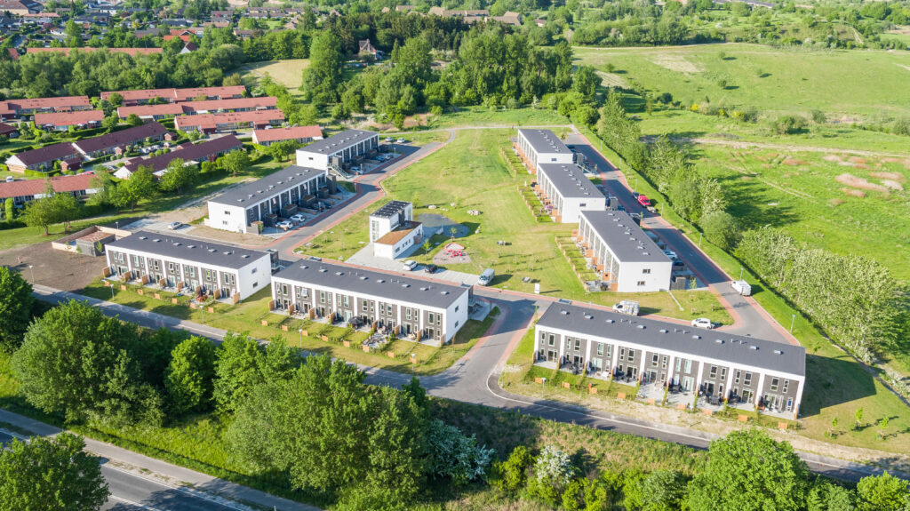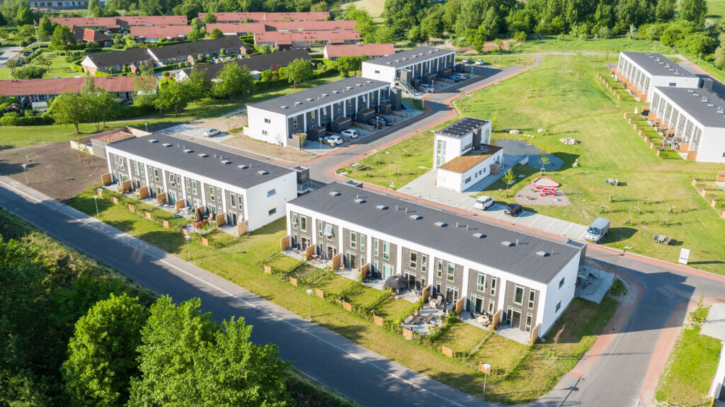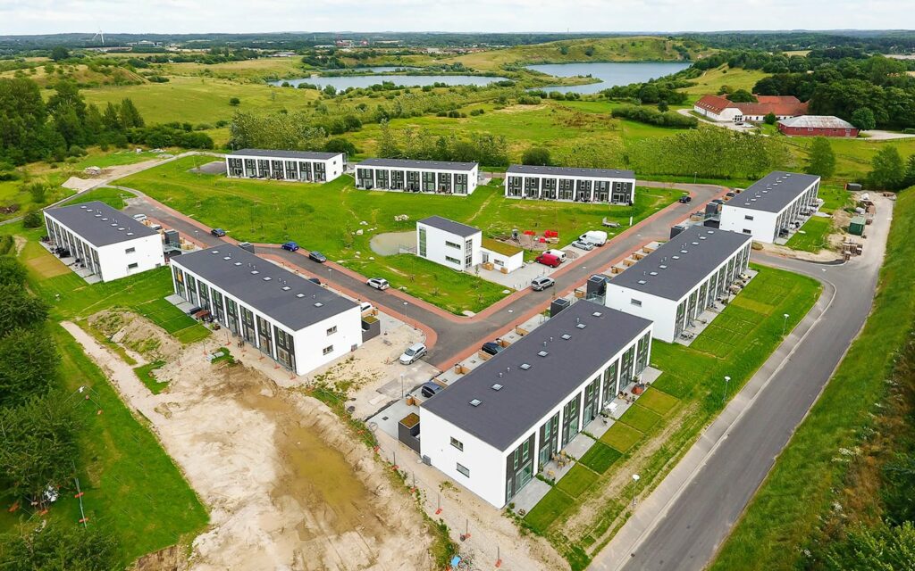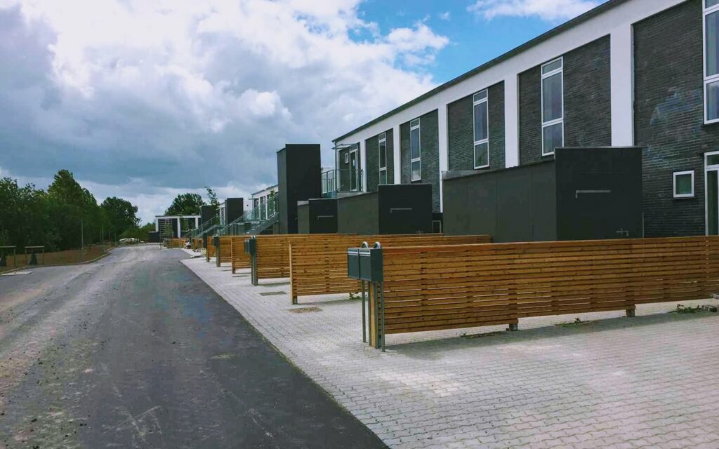 Boligerne er fordelt over otte boligrækker, der alle er i to etager.