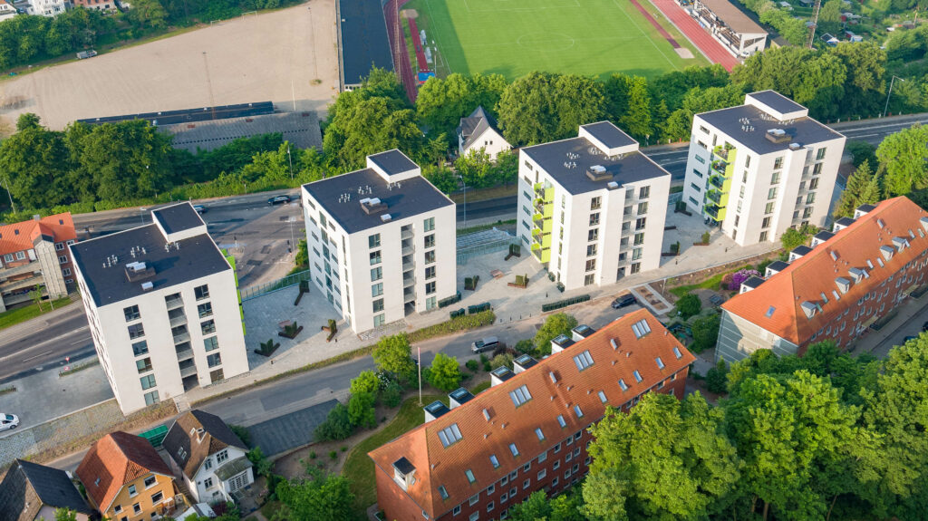 De i alt 84 tre– og fireværelses lejligheder er på mellem 95 og 133 m2. Punkthusene er seks og delvist syv etager, og er placeret på en grøn plint, hvorunder der er anlagt parkeringspladser.