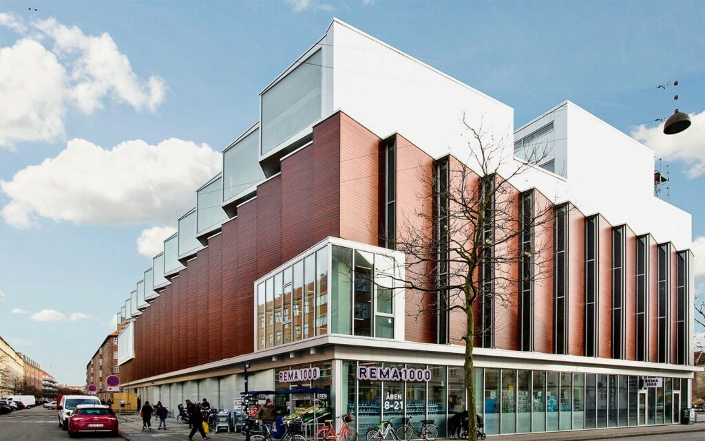 Byggeriet er imponerende og anmelderrost, grundet dets udførelse som en ’Amagermad’ – med butik i stueplan, fuld størrelse idrætshal på 1. salen og 12 ejerlejligheder på 2. salen. De store spændvidder i et halbyggeri som dette, vidner om det høje kompetenceniveau hos de planlæggende, koordinerende og udførende parter. Etagerne er lydisoleret så der ikke forekommer støjgener.